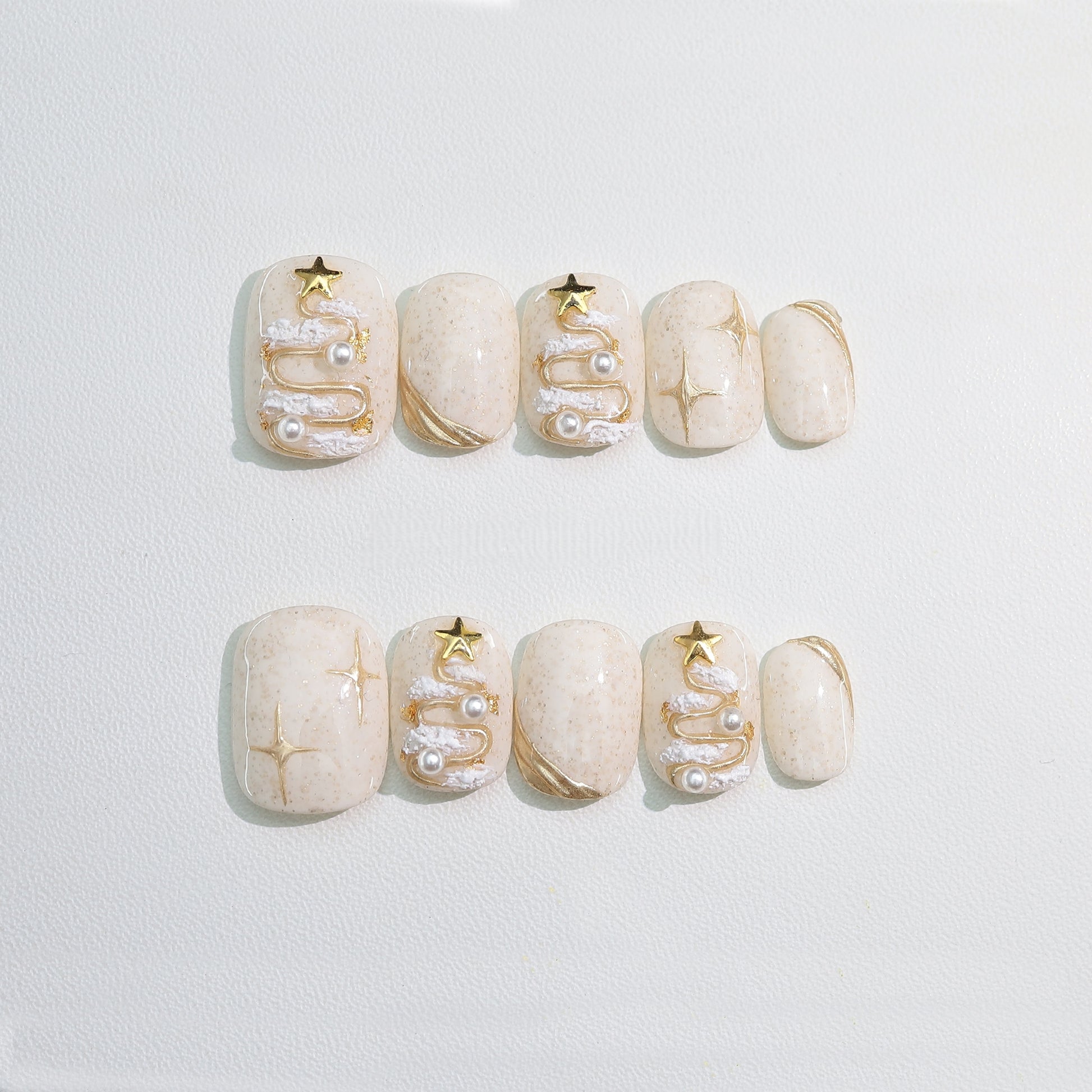 Beige Glided Gold Christmas Nail with Pearl - Medium Square