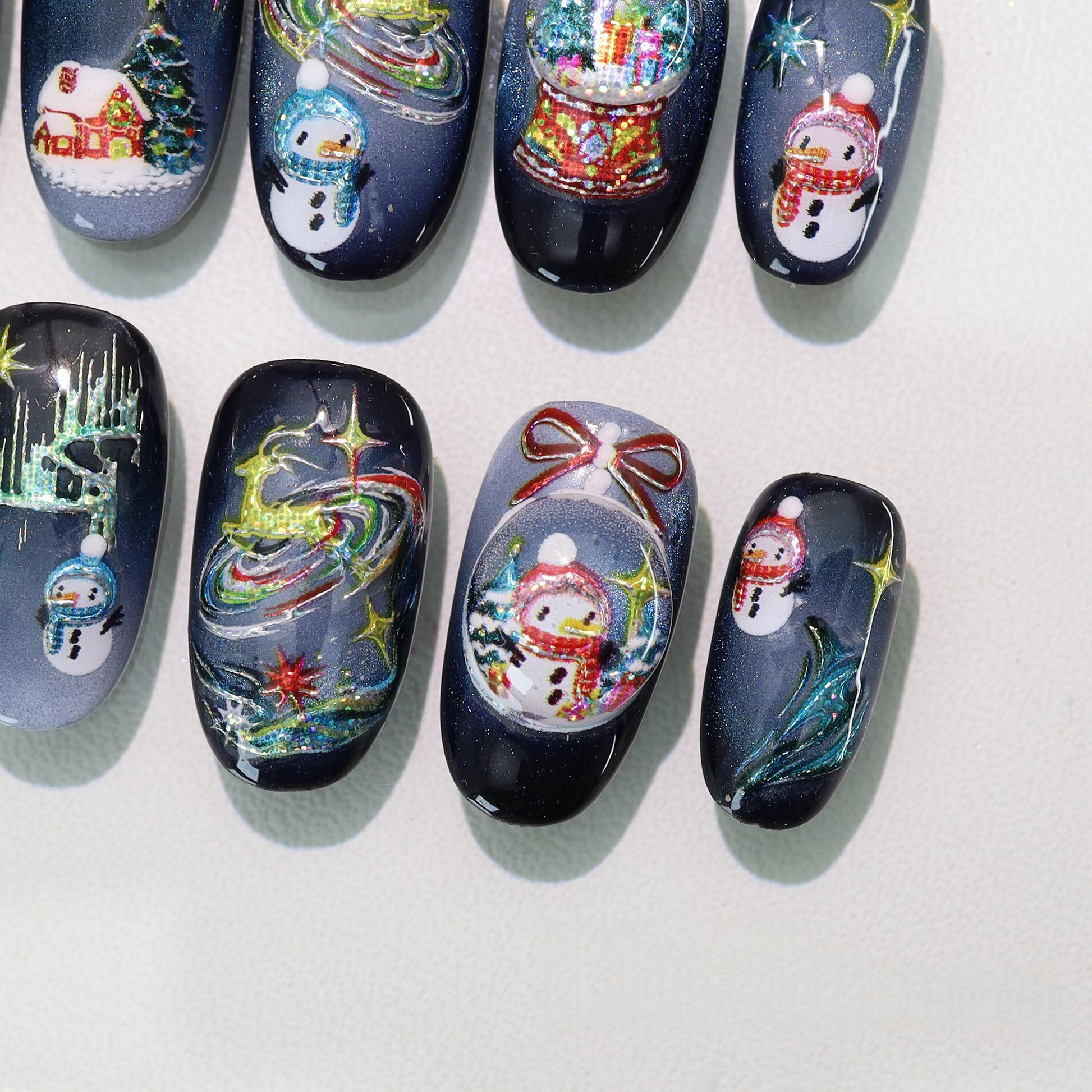 This stunning Christmas nail set captures the mystery and beauty of a starry winter sky, featuring hand-painted snowmen, auroras, and cozy holiday cottages.