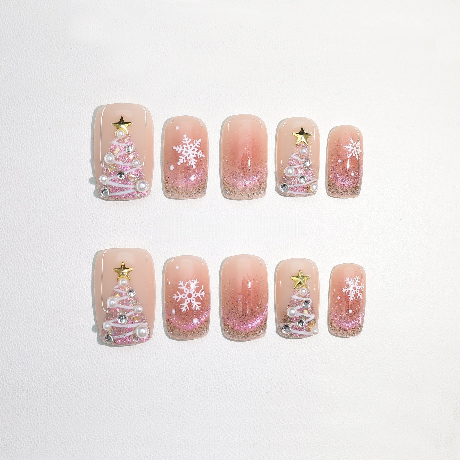 Pink Glided Gold Cat-eye Christmas Nail with Pearl - Medium Square
