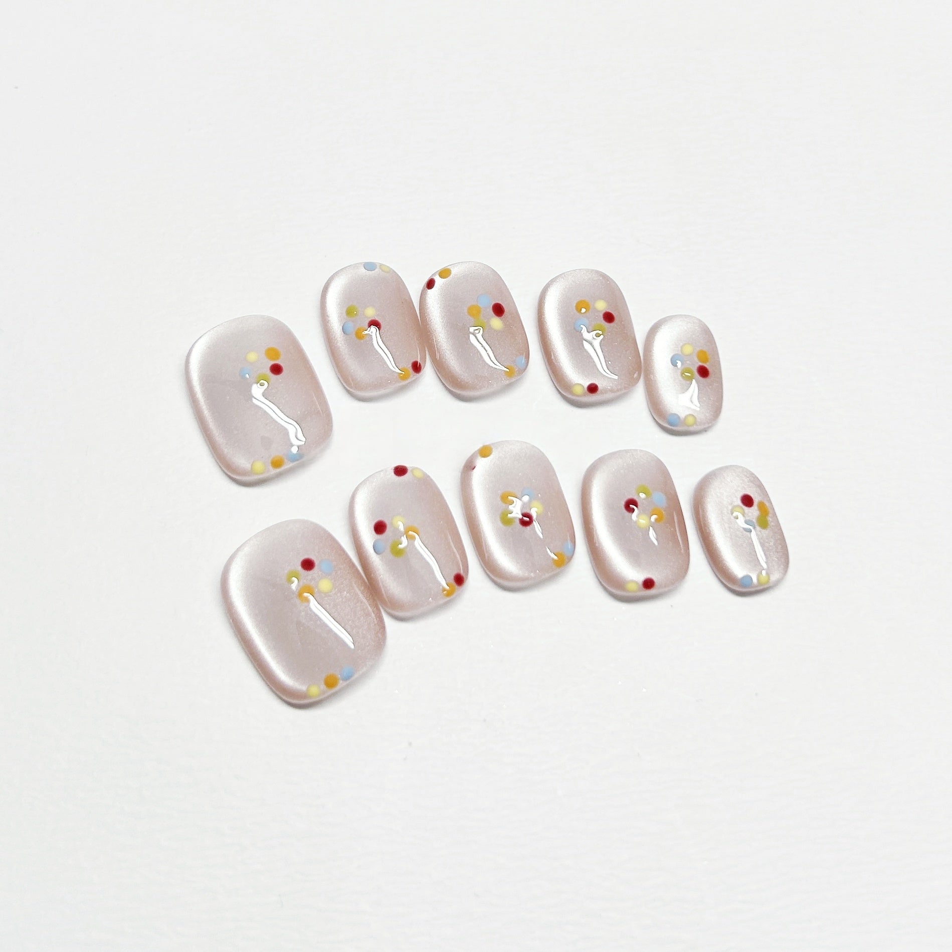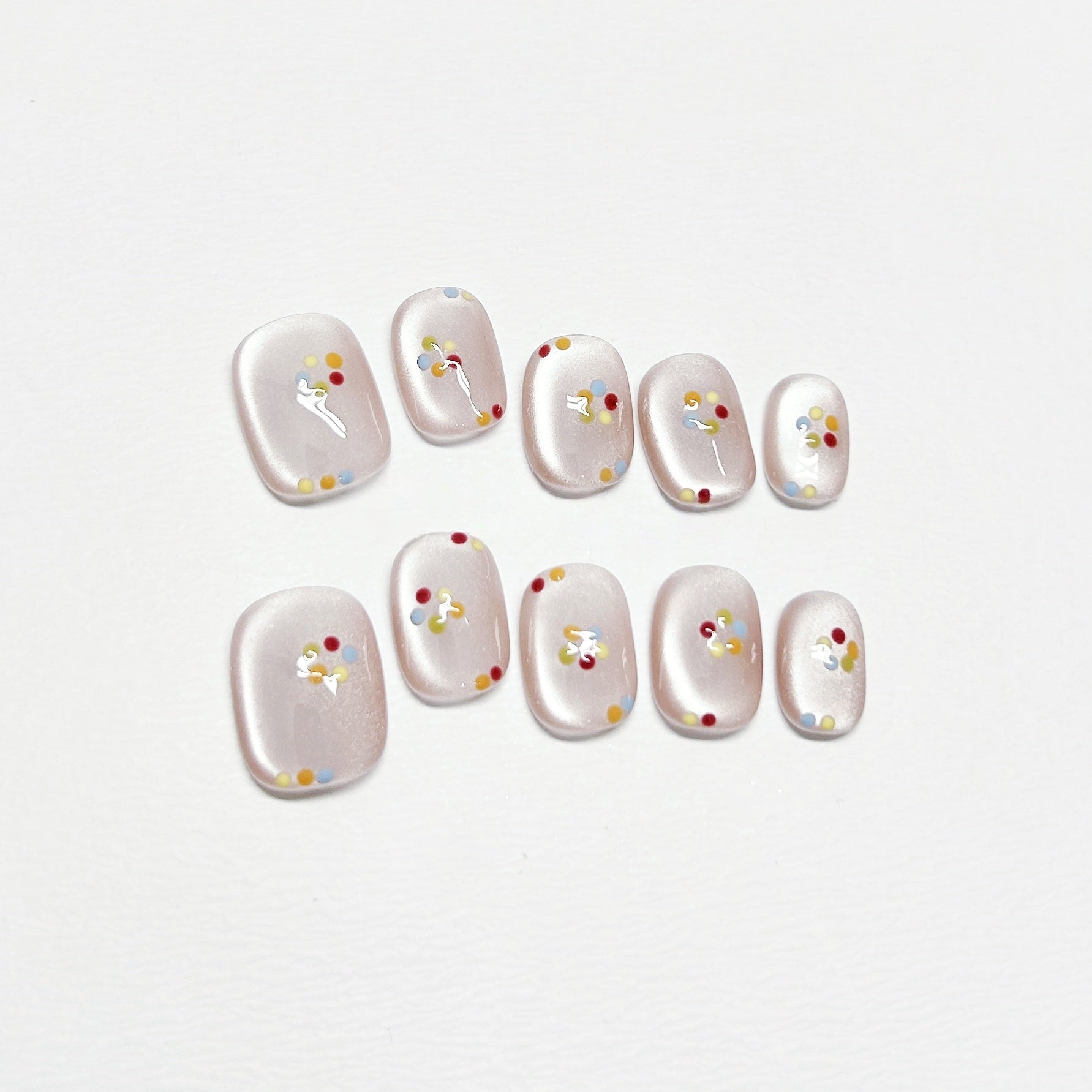 This cheerful nail set blends a pearly pink cat-eye base with colorful polka dots and tiny white bows.